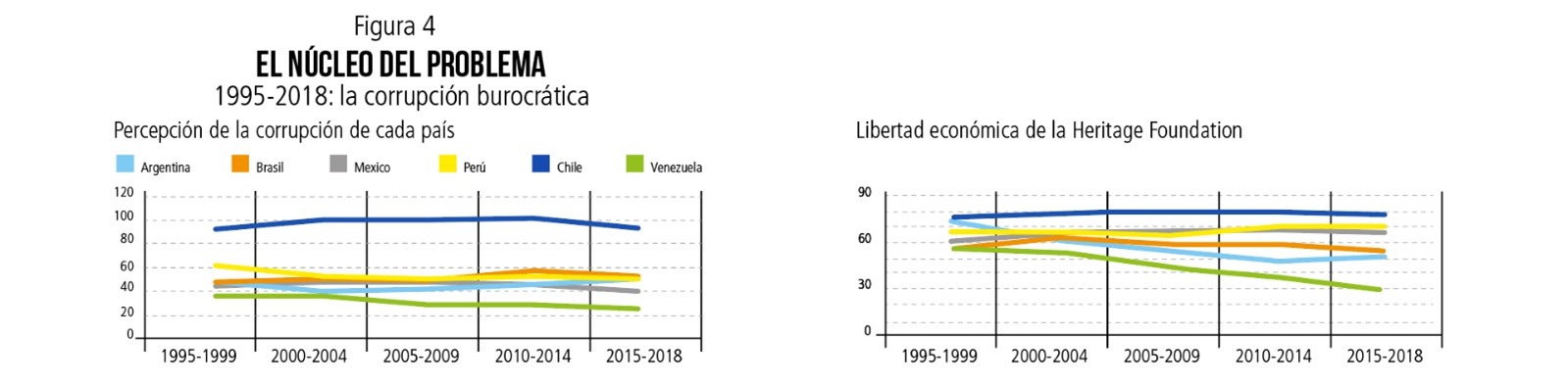 Es evidente que estamos ante un cuadro deprimente para una región que participa a grosso modo del 7% del producto global en la última década: Argentina y Brasil en persistente recesión; Chile, Perú y México con estancamiento recurrente; y –basados en las estimaciones disponibles– un colapso económico sin precedentes en la Venezuela de Chávez y Maduro. Nótese, que las cifras presentan una región en la que virtualmente la mayoría de ciudadanos cree que es muy rica. Vale la pena recordar aquí que –estrictamente hablando– el país más rico y con mayor cercanía al desarrollo económico es Chile, con apenas el 28% del producto por persona de un estadounidense en el último quinquenio.