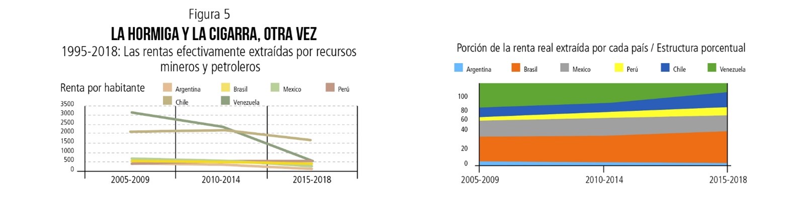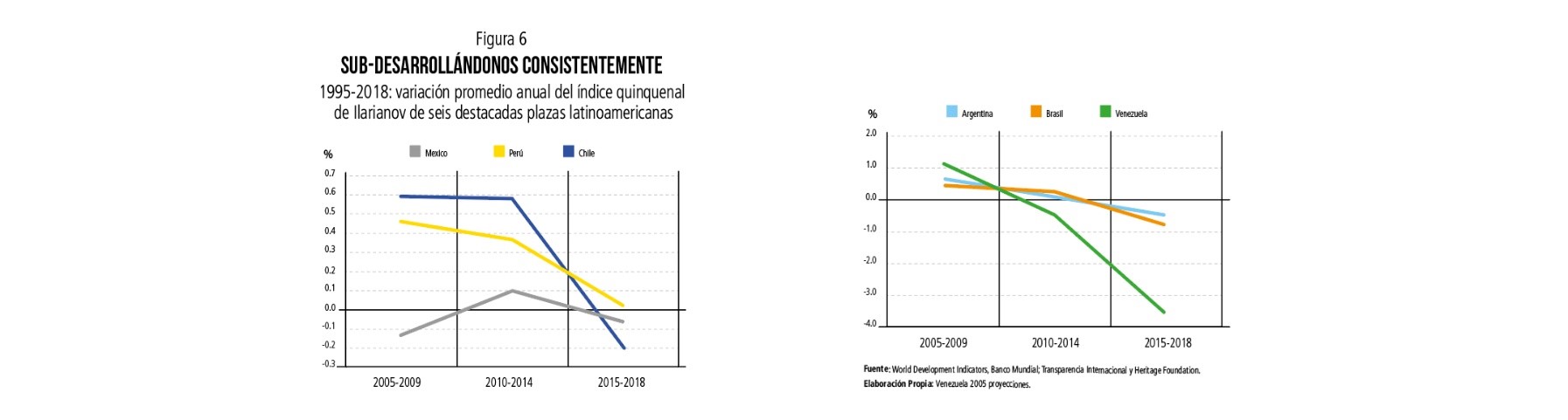 A continuación, nos interesa exponer a la discusión las cifras del último retorno del marxismo Latinoamericano. Para ello analizaremos el caso de seis economías emblemáticas de América Latina desde 1995. Es importante destacar que desde 1960 a la fecha estas seis economías no solamente explican cuatro quintos del PBI regional, sino que Argentina, Brasil, Chile, México, Perú y Venezuela representan verdaderos laboratorios de la realidad latinoamericana. Por un lado, Venezuela y Argentina son dos casos paradigmáticos globales de retroceso económico reciente. De otro lado, Brasil y México son ejemplos de estancamiento o de las potencias económicas que nunca llegaron a serlo. Y finalmente, Chile y Perú, representan los más cercanos ejemplos de milagro económico que ha registrado la región en las últimas siete décadas.